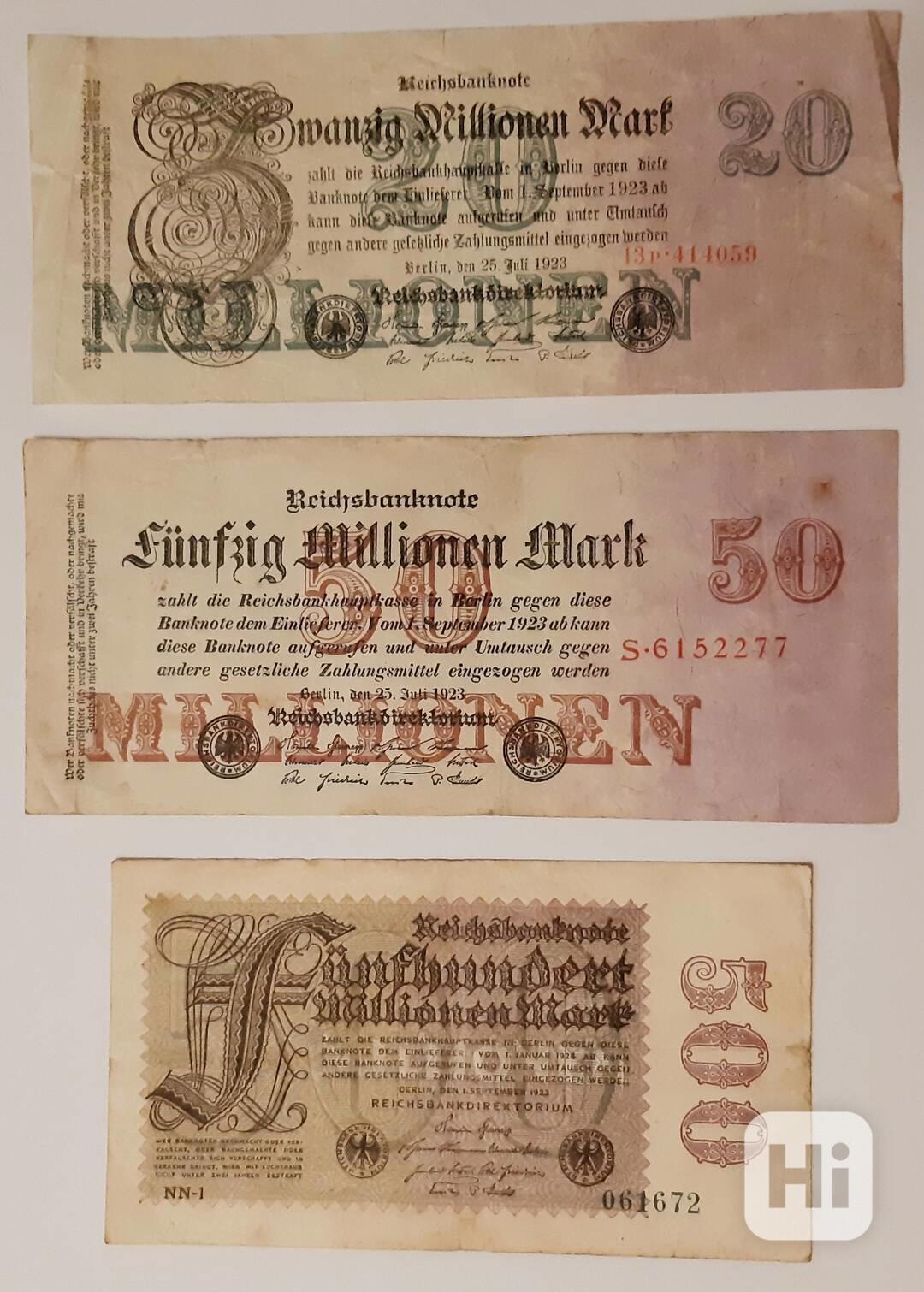 Vzácné německé bankovky z období Výmarské republiky (1919-1933) vydané v roce 1923 na vrcholu hyperinflace, kdy hodnota měny klesala trubulentní rychlostí téměř ze dne na den a nebyly výjimkou právě bankovky v hodnotě desítek milionů či stovek milionů marek, ale i vyšší v řádech miliard marek. Koncem roku 1923 podnikla německá vláda kroky ke stabilizaci ekonomiky a využila myšlenku na zavedení měny Rentenmark či rentové marky, kdy byla měna podložena nikoliv zlatem, ale půdou využívanou k zemědělství a podnikání, kdy by la tato půda dána do "zástavy". Tento krok pomohl obnovit důvěru obyvatel v měnu Rentenmark, stabilizovat měnu a dodnes je považován za hospodářský zázrak. Měna Rentenmark byla poté roce 1924 nahrazena měnou Reichsmark.